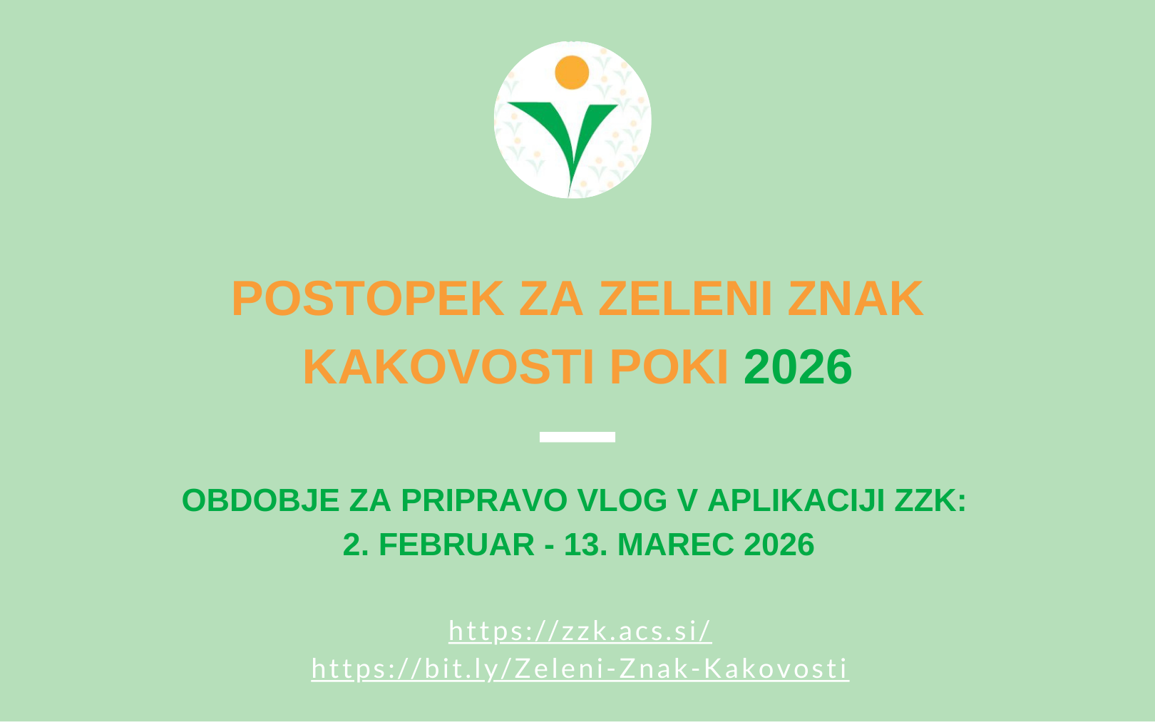 Na podlagi vaših sporočenih namer bo ACS organizacijam omogočil dostop do aplikacije, ki je namenjena pripravi in oddaji vlog terdokazil organizacij v postopkih za podeljevanje in podaljševanje pravice do uporabe ZZK. Obdobje, v katerem boste organizacije v spletni aplikaciji ZZK lahko pripravile in podkrepile vlogo z ustreznimi dokazili o izpolnjevanjumeril ter jo po spletu tudi oddale, bo trajalo od ponedeljka, 2. februarja 2026 do petka, 13. marca 2026. Zadnji rok za oddajo vloge bo petek, 13. marec 2026.